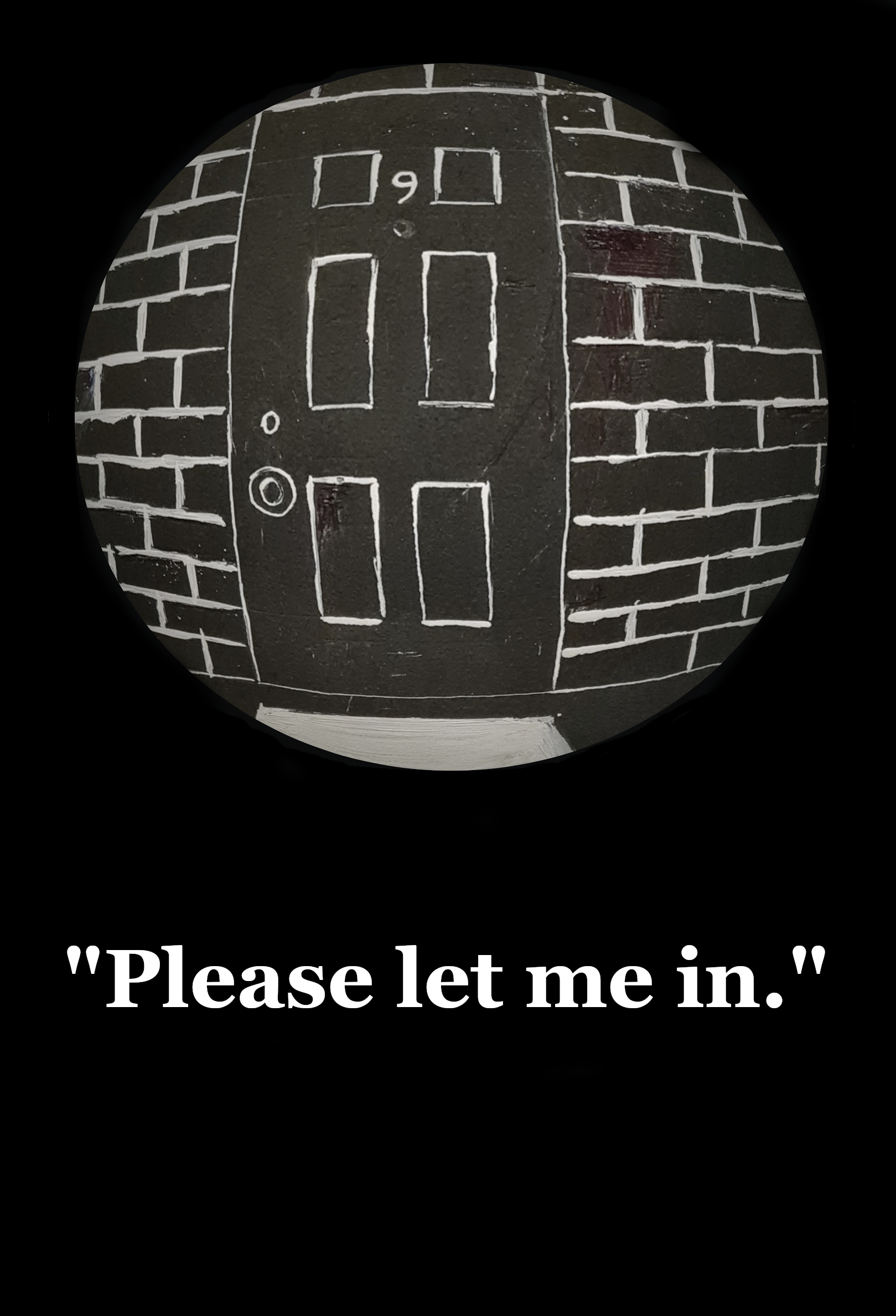 I turned my back on the door and started to make my way back to the recliner when the loud knocking broke the silence. I jumped and spun around, pretty sure that I peed myself a little. The pounding on the door was so violent and urgent that I felt the vibration. Silence fell again and I stood frozen in place. After a beat, that same quiet, high-pitched voice spoke again, “Please let me in.”